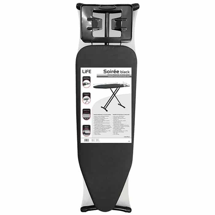Η κομψή σιδερώστρα LiFE SOIREE, διαθέτει μεγάλη επιφάνεια σιδερώματος 90 x 30cm με ύφασμα σε μαύρο χρώμα, ενσωματωμένη μεταλλική βάση για το σίδερο και μηχανισμό ασφαλείας για να κλειδώνει τόσο όταν την χρησιμοποιείτε όσο και όταν την έχετε αποθηκευμένη.