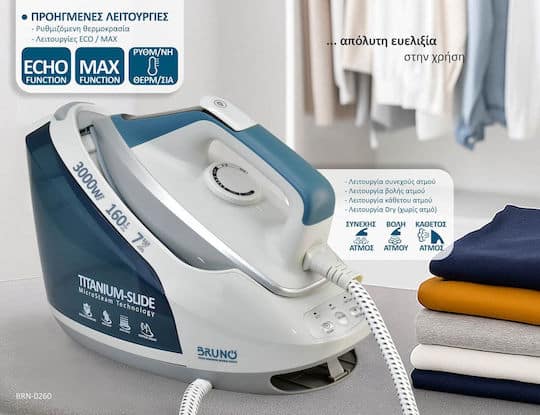 ✔ Με το BRUNO BRN-0260 σιδερώνεις γρήγορα και εύκολα, χάρη σε 3000W ισχύος και πίεση ατμού 7 bar.