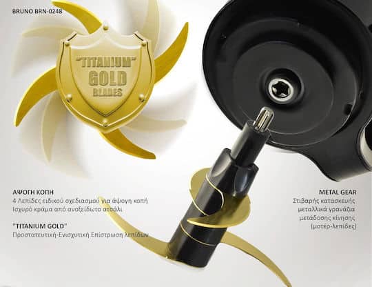 - Χαρακτηριστικά του η άψογη κοπή και η γρήγορη-άνετη χρήση, χάρις στις 4 μεγάλες λεπίδες ειδικού σχεδιασμού “TITANIUM GOLD”, στο πανίσχυρο τύπο μοτέρ 500W καθώς και την στιβαρή κατασκευή μηχανικών τμημάτων με μεταλλικά γρανάζια μετάδοσης κίνησης.