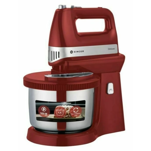 Singer Deluxe SM-500 Μίξερ με Inox Κάδο 3lt Κόκκινο 500W (ΕΩΣ 12 ΔΟΣΕΙΣ) Το μίξερ 2 σε 1 της Singer μπορεί να χρησιμοποιηθεί ανεξάρτητα από τη βάση του ως μίξερ χειρός. Όποια κι αν είναι η επιλογή λειτουργίας του, είναι ό,τι πιο πολύτιμο στην κουζίνα σας, για να κάνετε πράξη τις γλυκές ή αλμυρές αλχημείες σας! ΤάσηV: 220-240 Συχνότητα Hz: 50-60 Ισχύς Watt: 500 Ταχύτητες: 5 Λειτουργία turbo: Ναι Προστατευτικό κάλυμμα μπολ: Ναι Διαστάσεις (ΜxBxY)cm: 28,9×19,9×33,4 Βάρος kgr: 2,2 Χρώμα: Κόκκινο – Inox